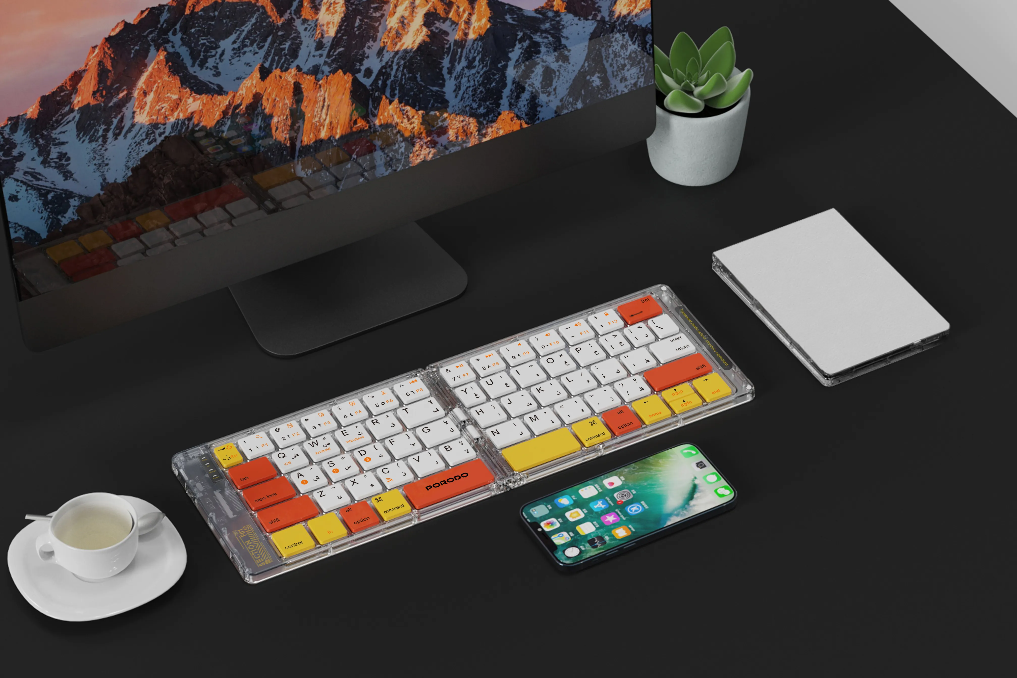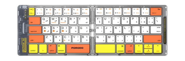کیبورد بیسیم Porodo Crystal Shell باریک، جمعوجور و قابل حمل است. کارایی و تطبیقپذیری برای تایپ با باتری لیتیومی 80 میلیآمپر ساعتی آن، با عملکرد مداوم بلوتوث تا برد 10 متر، برای کار یا مطالعه در حال حرکت ایدهآل است. این کیبورد که به کلیدهای قیچی مجهز است، دارای طرح 65 کلیدی شامل زبان عربی است که در نهایت به کاربران دو زبانه اجازه میدهد از تایپ روان و سریع لذت ببرند. این کیبورد همچنین با ویندوز، iOS، اندروید و مک سازگار است. این کیبورد به راحتی به دستگاهها متصل میشود. در این طراحی تاشو، یک قاب پشتی چرمی برای دوام و ایجاد حس شیکتر برای حملونقل بیشتر وجود دارد. این دستگاه به پورت شارژ Type-C مجهز است و با سرعت 50 تا 100 میلیآمپر شارژ میشود. زمان خواب 10 دقیقه است که باعث صرفهجویی در مصرف انرژی میشود. کیبورد بیسیم Porodo Crystal Shell جمعوجور، شیک و کارآمد است و بدون از دست دادن عملکرد، آن را راحت میکند.