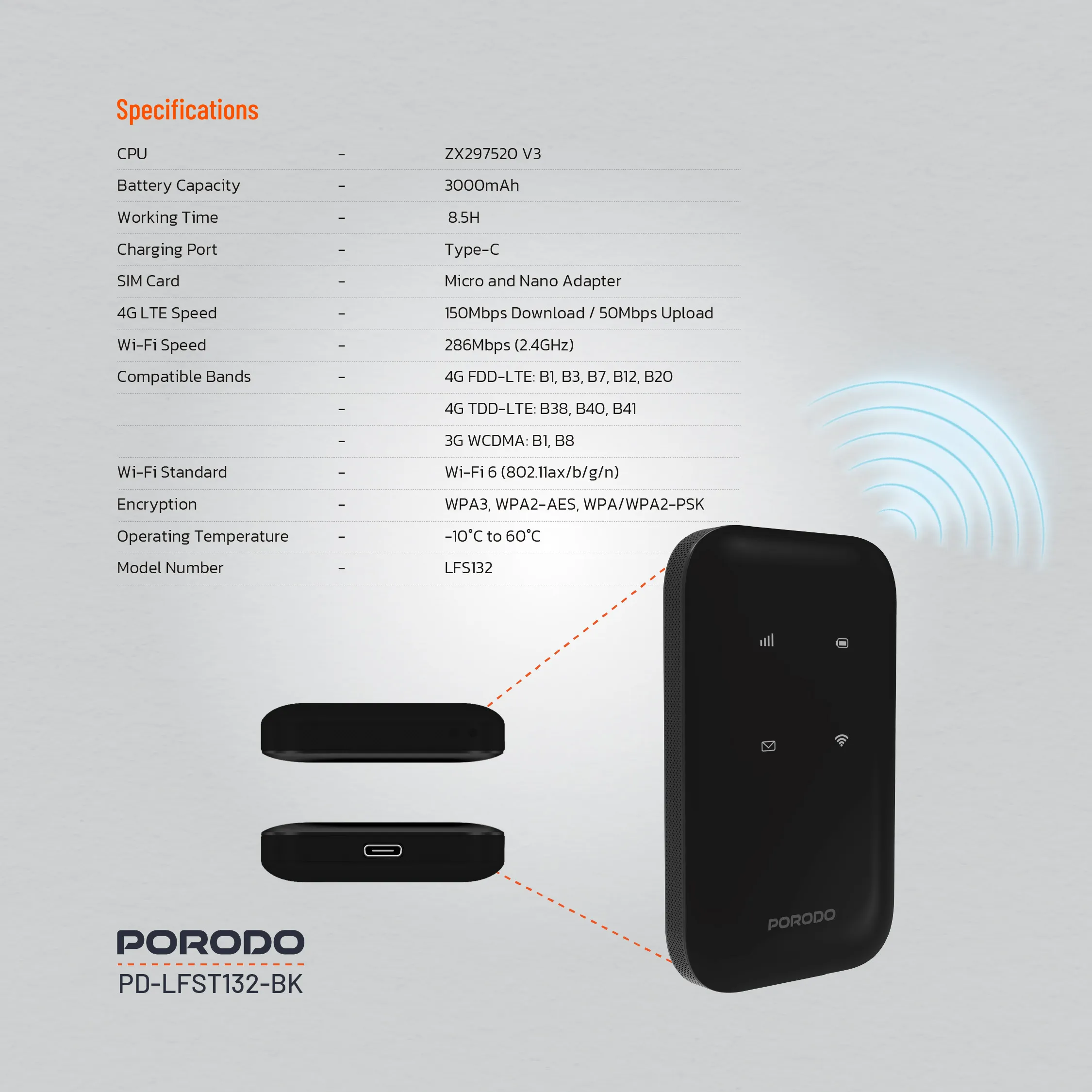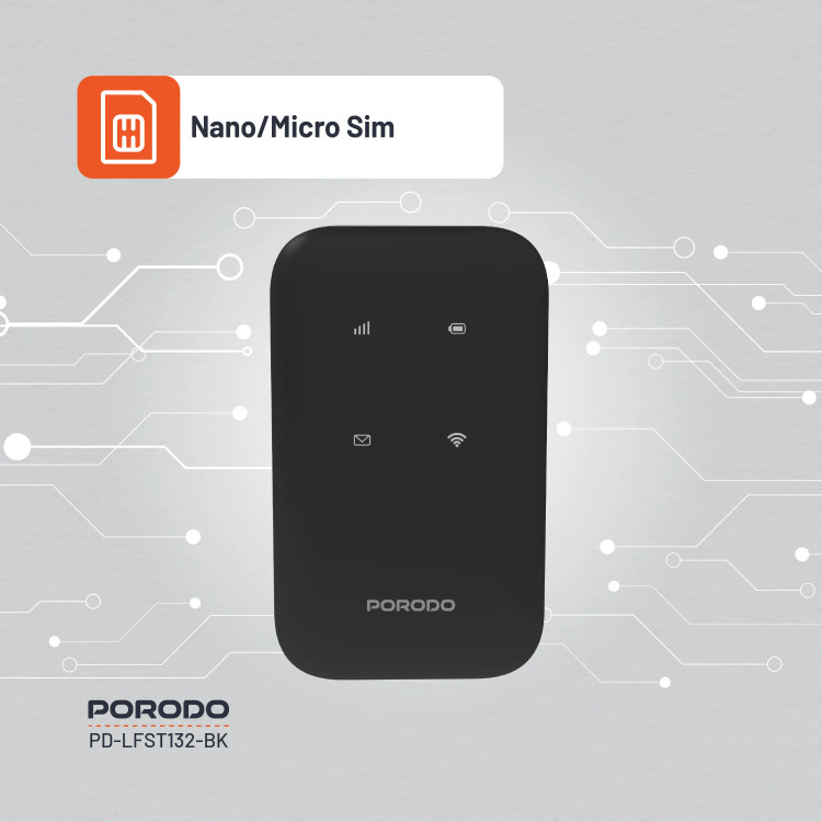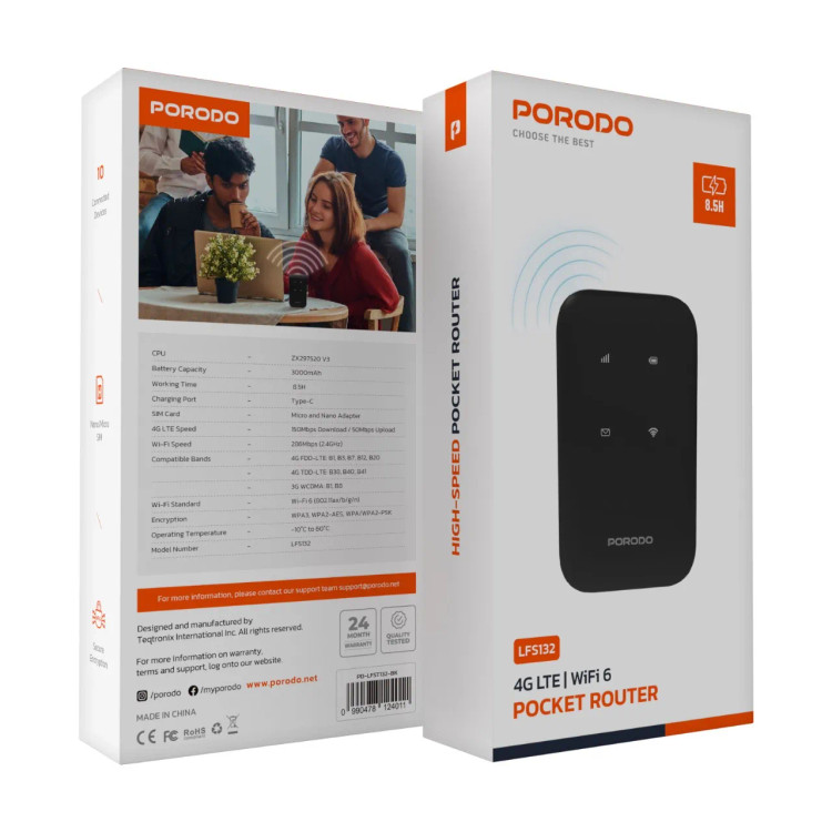 Porodo Pocket Router 4G LTE | WiFi 6 دسترسی ثابت و سریع به اینترنت را در هر مکانی ارائه می دهد. دارای یک CPU ZX297520 V3 برای ارائه عملکرد نرم و ابریشمی برای تمام کارهای مرور و پخش است. این دستگاه دارای ظرفیت باتری 3000 میلی آمپر ساعتی است که می تواند تا 8.5 ساعت استفاده بی وقفه را برای شما فراهم کند و به راحتی از طریق درگاه Type-C شارژ شود. سرعت سوزان 4G LTE با دانلود 150 مگابیت در ثانیه و آپلود 50 مگابیت در ثانیه و سرعت WiFi 286 مگابیت در ثانیه در باند 2.4 گیگاهرتز را تجربه کنید. روتر قادر است بسیاری از باندهای پشتیبانی شده از جمله 4G FDD-LTE، TDD-LTE و 3G WCDMA را مدیریت کند. این روتر همچنین دارای WiFi 6 با قابلیت های اتصال و امنیتی پیشرفته با پشتیبانی از رمزگذاری WPA3 است. روتر جیبی Porodo حداکثر 10 دستگاه را به طور همزمان پشتیبانی می کند که برای استفاده در دفتر یا خانواده ایده آل است. سیمکارت نانو/میکرو قابلحمل و قابل حمل، همچنین برای سفر ایدهآل است.