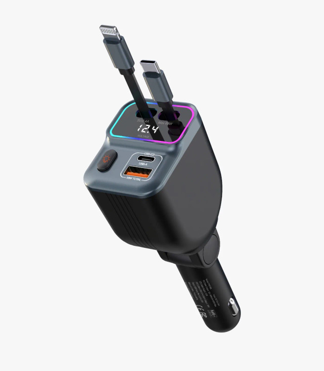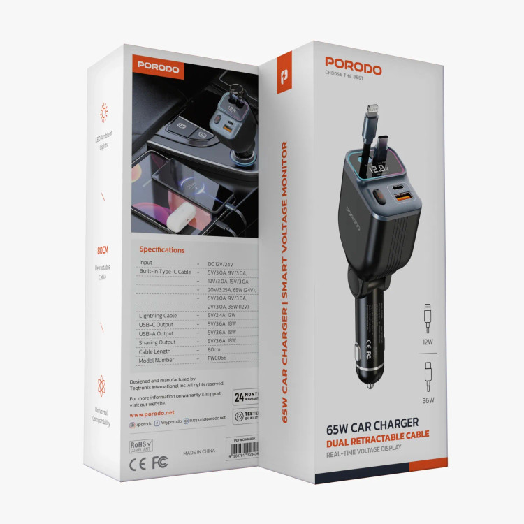 شارژر فندکی دوکاره Porodo 65W Car Charger، دستگاهی ایدهآل برای شارژ چندین گجت در حال حرکت است. با ورودی DC 12V/24V، میتوان از آن در وسایل نقلیه مختلف استفاده کرد. این شارژر فندکی دارای یک کابل Type-C داخلی است که از شارژ سریع با خروجی 65W (24V) و 36W (12V) برای شارژ سریع دستگاههای پشتیبانیکننده شما پشتیبانی میکند. به عنوان یک جایگزین، میتوانید از کابل Lightning با شارژ 12W (5V/2.4A) و سپس خروجیهای USB-C و USB-A که هر کدام 18W (5V/3.6A) تولید میکنند، استفاده کنید، بنابراین با شارژ تلفن هوشمند و سایر دستگاههای شما سازگار است. کابلهای جمعشونده 80 سانتیمتری راحتی را ارائه میدهند و شما را منظم نگه میدارند، در حالی که چراغهای LED محیطی، زیبایی بیشتری به آن میبخشند. این شارژر فندکی با سازگاری جهانی، میتواند شما را در طول رانندگیهای طولانی متصل و شارژ نگه دارد. این شارژر فندکی برای هر کسی که در سفر به شارژ سریع و قابل اعتماد نیاز دارد، ضروری است.