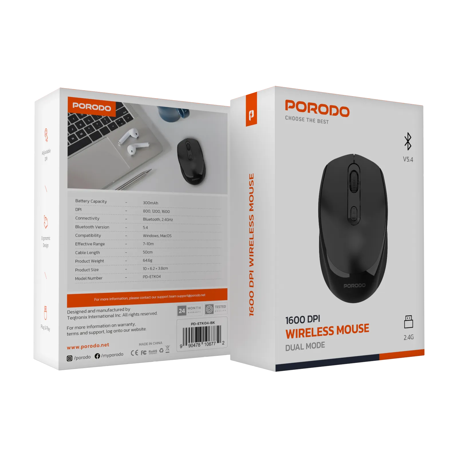ماوس بیسیم Porodo با حالت دوگانه، تجربهای راحت و روان را برای کار و بازی به شما ارائه میدهد. این ماوس با عمر باتری ۳۰۰ میلیآمپر ساعت، دوره عملکرد افزایشیافتهای را برای استفاده سنگین به شما ارائه میدهد. DPI قابل تنظیم روی ۸۰۰، ۱۲۰۰ و ۱۶۰۰ است که به شما امکان کنترل دقیق مکاننما را میدهد. این ماوس با بلوتوث و ۲.۴ گیگاهرتز سازگار است و با بلوتوث نسخه ۵.۴ برای اتصال فوری و پایدار سازگار است. سازگار با ویندوز و MacOS، برای استفاده با انواع دستگاهها عالی است. با برد مؤثر ۷ تا ۱۰ متر، امکان انعطافپذیری در استفاده بدون نیاز به نشستن در کنار دستگاه وجود دارد. طراحی ارگونومیک آن، نگه داشتن آن را برای ساعتها استفاده بدون ایجاد فشار روی دست آسان میکند. قابلیت اتصال و استفاده آسان به این معنی است که میتوانید بلافاصله بدون نصب نرمافزار شروع به کار کنید. با داشتن کابل ۵۰ سانتیمتری، در صورت نیاز راحتی بیشتری را برای کار با سیم ارائه میدهد.
