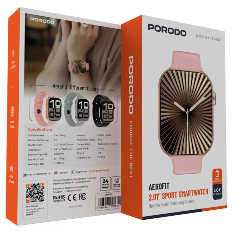 ساعت هوشمند ورزشی Porodo Aerofit 2.01 اینچی که برای کسانی که به دنبال تعادل بین سبک، عملکرد و کاربردی بودن هستند، ساخته شده است، دارای یک صفحه نمایش 2.01 اینچی IPS HD با وضوح 240 × 296 پیکسل است که بسیار روشن و واضح است. سنسورهای متعدد نظارت بر سلامت، حرکات روزانه، ورزش و علائم حیاتی شما را ردیابی میکنند - یک همراه عالی برای تناسب اندام. بلوتوث 5.3 اتصال خوبی با اندروید نسخه 5.0 و بالاتر و همچنین iOS نسخه 9.0 و بالاتر ارائه میدهد. بدنه آلیاژ روی، در کنار رتبه IP65 برای مقاومت در برابر آب، برای مقاومت در برابر آزمایشهای روزمره در عین حال مدرن و اسپرت بودن طراحی شده است. باتری 200 میلیآمپر ساعتی آن 3 تا 5 روز کار میکند، در حالی که زمان آماده به کار تقریباً 10 تا 12 روز است. این یک مزیت با زمان شارژ کمتر است. دستیار صوتی، کنترل شاتر دوربین و سایر عملکردهای جذاب، آن را نه تنها به یک ساعت هوشمند صرف، بلکه به یک وسیله ضروری برای سبک زندگی تبدیل میکند.