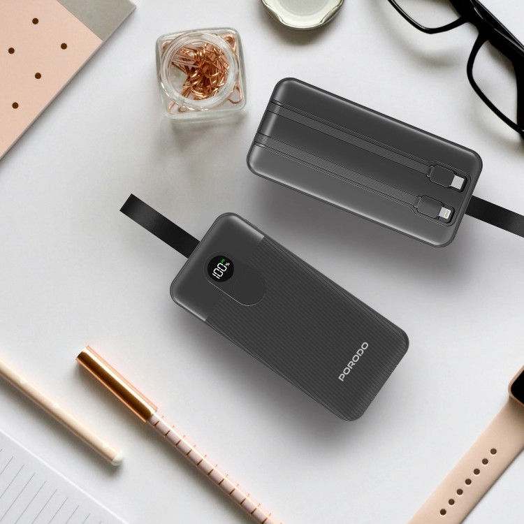 پاوربانک Porodo 50000mAh Integrated Cables - Black را انتخاب کنید که ظرفیت و قابلیت شارژ بسیار خوبی برای همه دستگاههای شما دارد. اکثر پاوربانکها چنین ظرفیتی دارند و دارای یک باتری عظیم 50000 میلیآمپر ساعتی (185 وات ساعت، 3.7 ولت) هستند که آن را به یک وسیله قابل اعتماد برای جابجایی تبدیل میکند. این پاوربانک دارای پورتهایی برای خروجیهای مختلف از جمله خروجی USB-C: 5V/3A، 9V/2.22A، 12V/1.67A و 20W؛ خروجی USB-A: 5V/3A، 9V/2A، 12V/1.5A و 22.5W برای شارژ سریع است؛ در حالی که کابلهای داخلی شامل خروجیهای USB-C و Lightning به ترتیب با ولتاژ 5V/3A و 5V/2.4A هستند. به این ترتیب، افراد میتوانند چندین دستگاه را به طور همزمان شارژ کنند و صفحه نمایش دیجیتال دقیقاً میزان شارژ باقی مانده در آن را نشان میدهد. طول عمر چرخه شارژ آن بیشتر یا مساوی ۳۰۰ بار است و در محدوده دمایی ۱۰- تا ۶۰ درجه سانتیگراد کار میکند که آن را برای مصارف روزمره بسیار مفید میسازد. ۳۵ دقیقه برای شارژ ۰٪ تا ۶۰٪.
