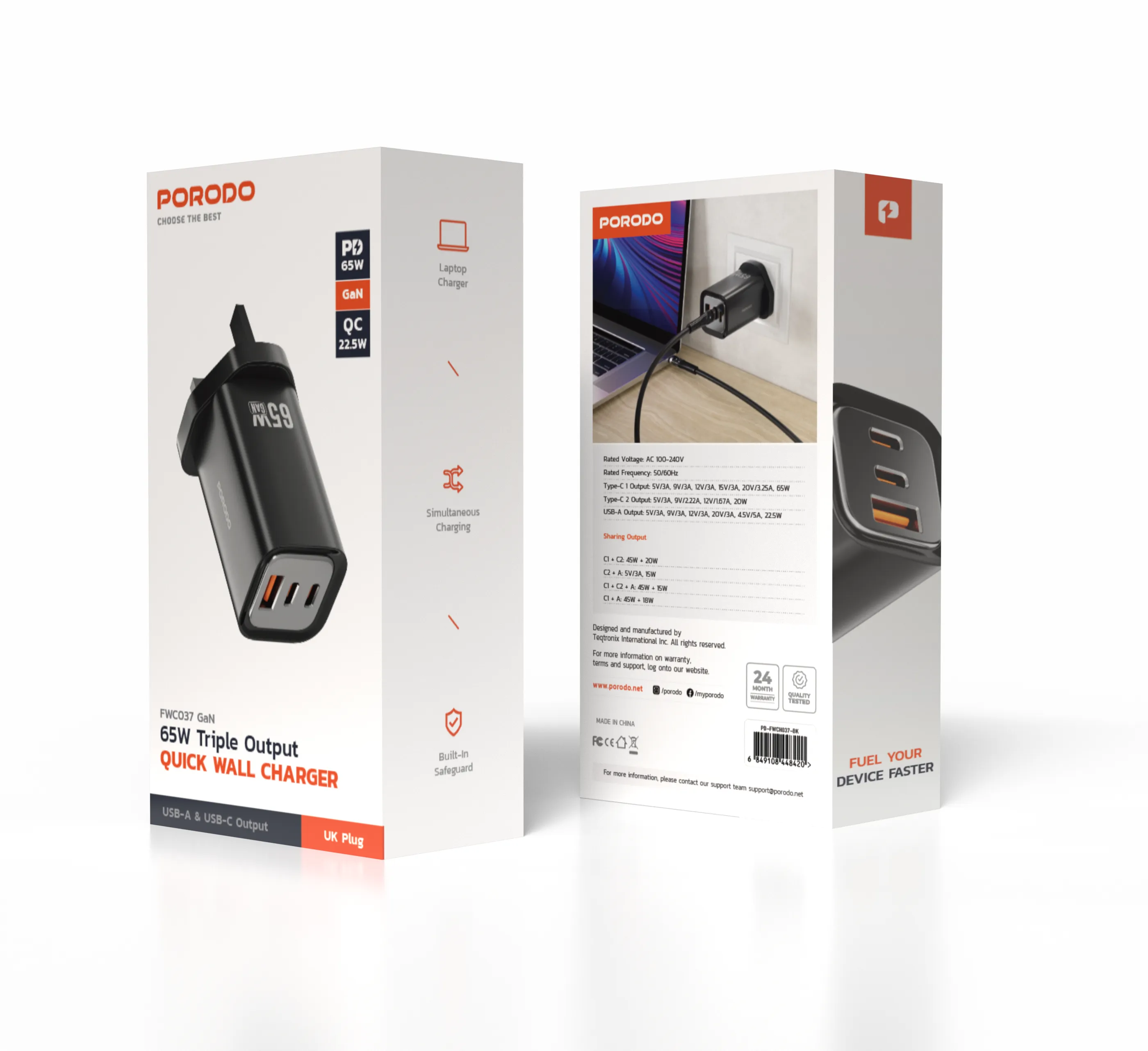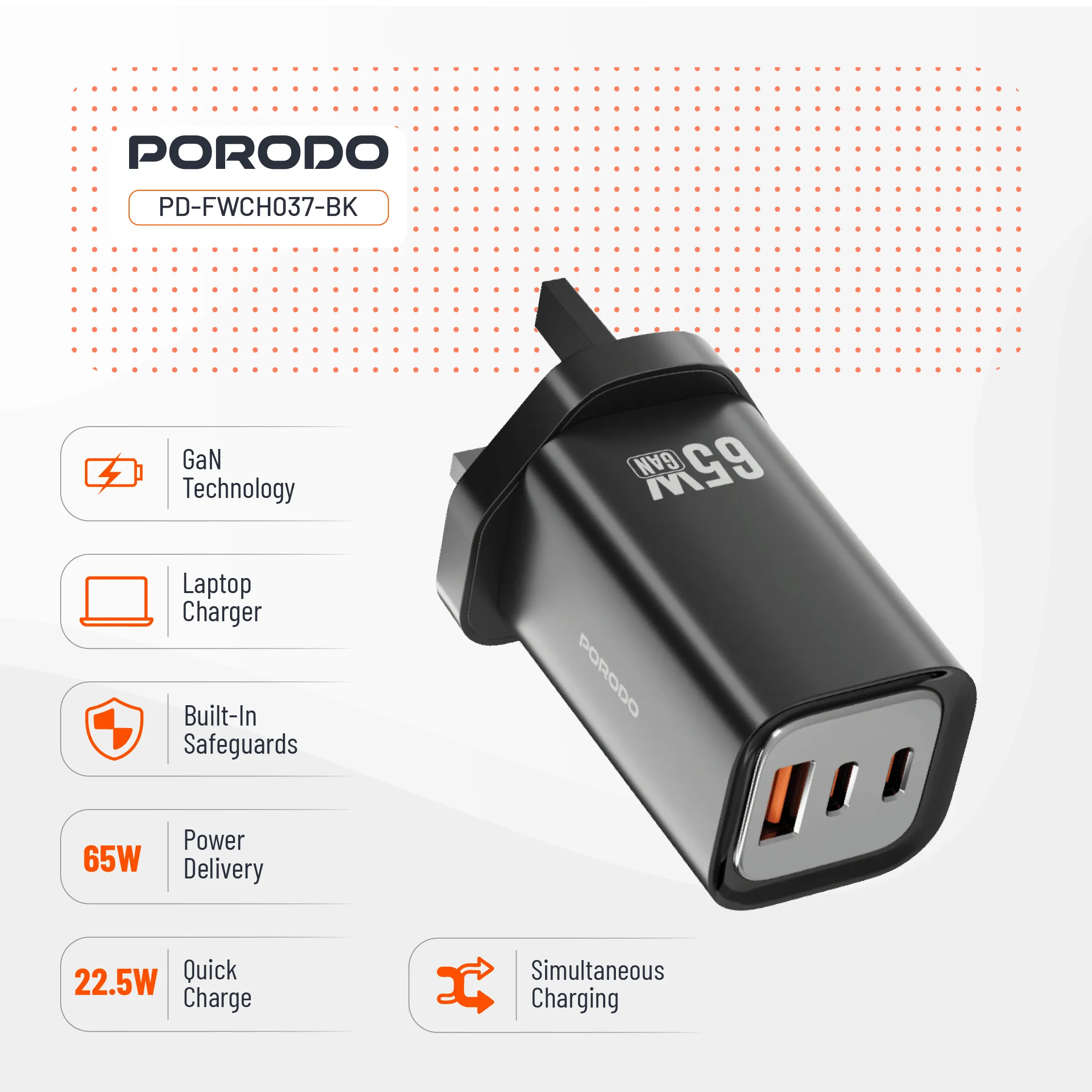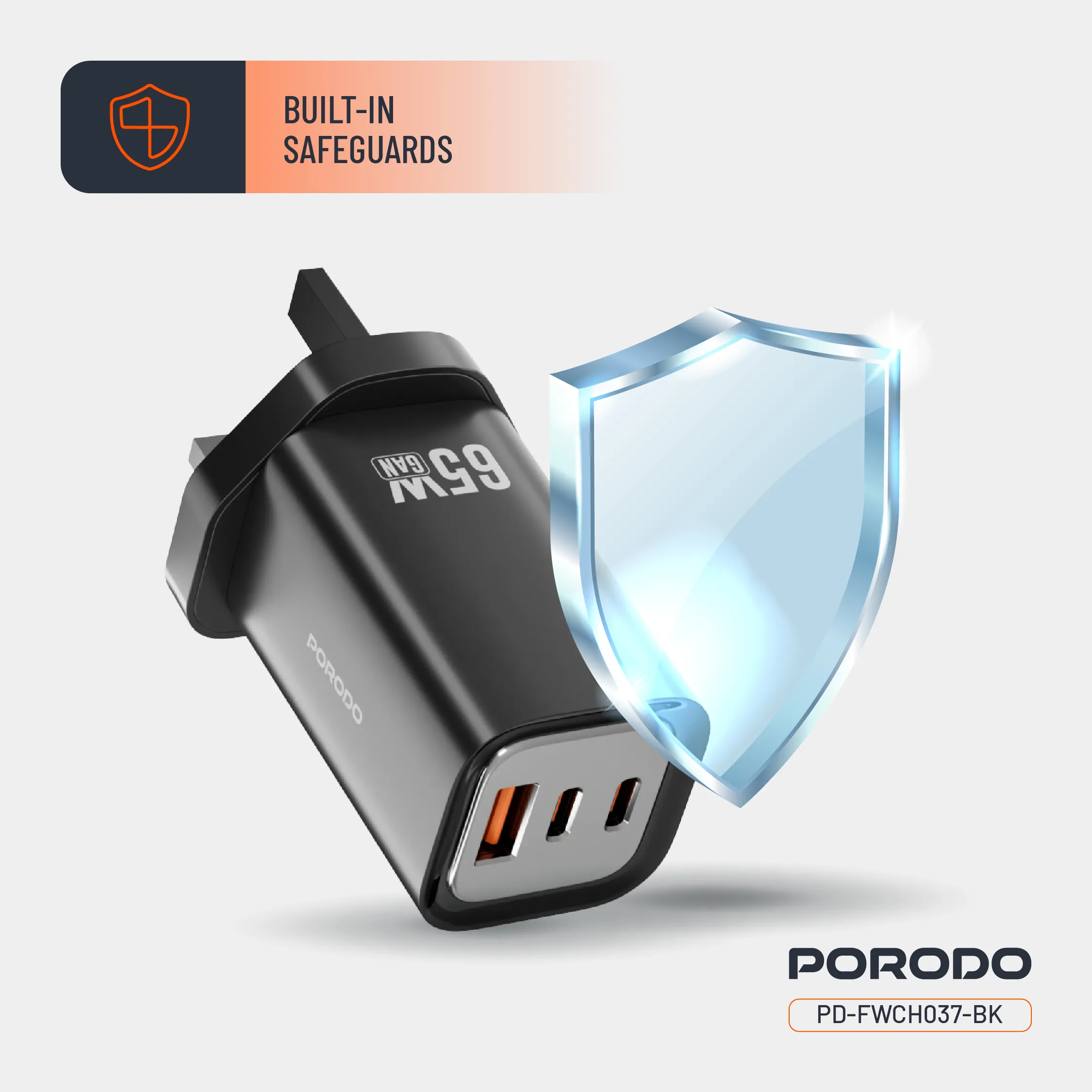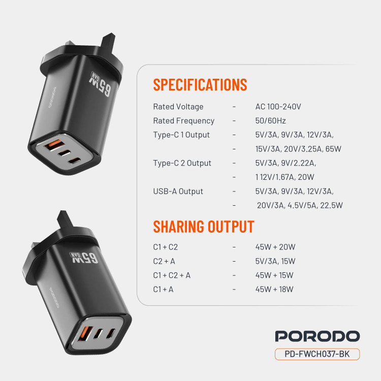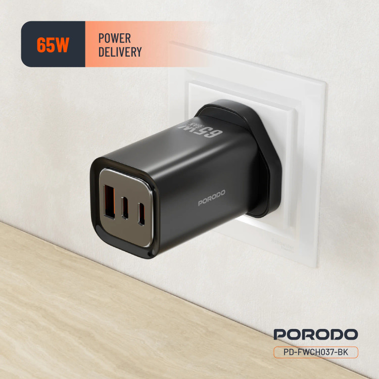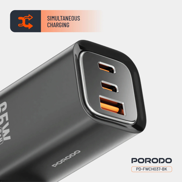 شارژر دیواری سریع سه خروجی Porodo 65W برای شارژ همزمان چندین دستگاه با پشتیبانی از شارژ سریع طراحی شده است. این شارژر با خروجی Type-C 1 (65W)، خروجی Type-C 2 (20W) و خروجی USB-A (22.5W) از طیف وسیعی از دستگاهها، از تلفنهای هوشمند گرفته تا تبلتها و لپتاپها، پشتیبانی میکند. خروجی Type-C 1 + Type-C 2، خروجی ترکیبی 45W + 20W را ارائه میدهد که به شما امکان میدهد دو دستگاه را با سرعت کامل شارژ کنید. با فناوریهای QC 22.5W و PD 65W، این شارژر ضمن محافظت از دستگاههای شما، به سرعت دستگاههای شما را شارژ میکند. محافظ داخلی در برابر شارژ بیش از حد، گرمای بیش از حد و اتصال کوتاه، با دوام و آرامش خاطر محافظت میکند. ورودی AC 100-240V آن را در هر نقطه از جهان سازگار میکند و چندین دستگاه را به طور همزمان با بهترین توزیع برق شارژ میکند. شارژر دیواری سریع سه خروجی Porodo 65W جمع و جور اما بسیار قدرتمند، برای شارژ ایمن، سریع و ایمن در خانه و سفر عالی است.