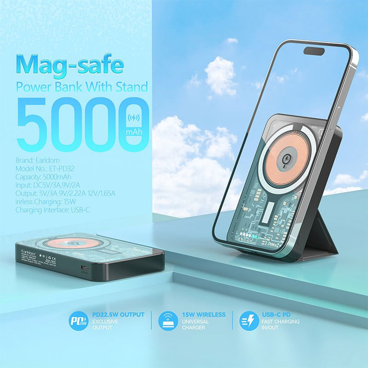 پاور بانک بی سیم فست شارژ ارلدام ET-PD32 QC PD 22.5W ظرفیت 5000 میلی آمپر ساعت
