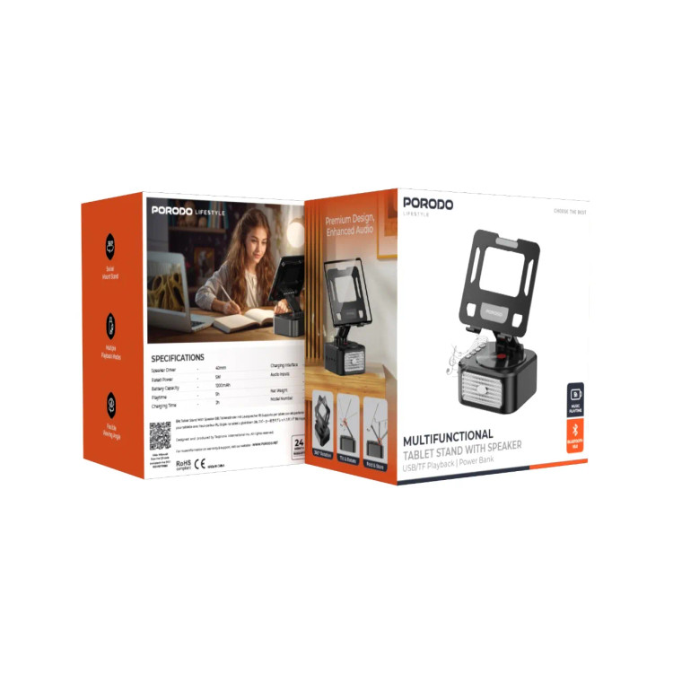 پایه بلندگوی تبلت چندمنظوره Porodo Lifestyle، زیبایی بلند، واضح و همهکاره را در طراحی مشکی هنرمندانه و شیک خود به نمایش میگذارد. این پایه دارای یک درایور بلندگو به اندازه ۴۰ میلیمتر و قدرت ۵ وات است که همه چیز را از موسیقی بلند و واضح گرفته تا صداهای آرام برای نیازهای سرگرمی شما ارائه میدهد. این بلندگو را میتوان به مدت ۳.۵ ساعت متوالی با باتری ۱۲۰۰ میلیآمپرساعتی استفاده کرد و در ۱.۵ ساعت از طریق رابط USB-C بسیار سریع شارژ میشود. داشتن چندین گزینه ورودی صدا، به خوبی توسط بلوتوث، AUX، Micro SD و فلش مموری USB انجام میشود. این پایه یک سیستم نصب رابط سرگرمی است. از چرخش ۳۶۰ درجه پشتیبانی میکند، با تنظیمات زاویه شیب و چرخش برای تنظیم تبلت شما در زاویه دید مناسب، استفاده راحت با زاویه دید آزاد را تضمین میکند. به لطف بلوتوث نسخه ۵.۰، اتصال پایدار میماند. قابلیت تاشو و نگهداری، آن را نامحسوس، جمع و جور و سبک نگه میدارد. راه حل ایدهآل برای کسانی که به دنبال یک پایه چندمنظوره با کیفیت صدای عالی و گزینههای متنوع هستند.