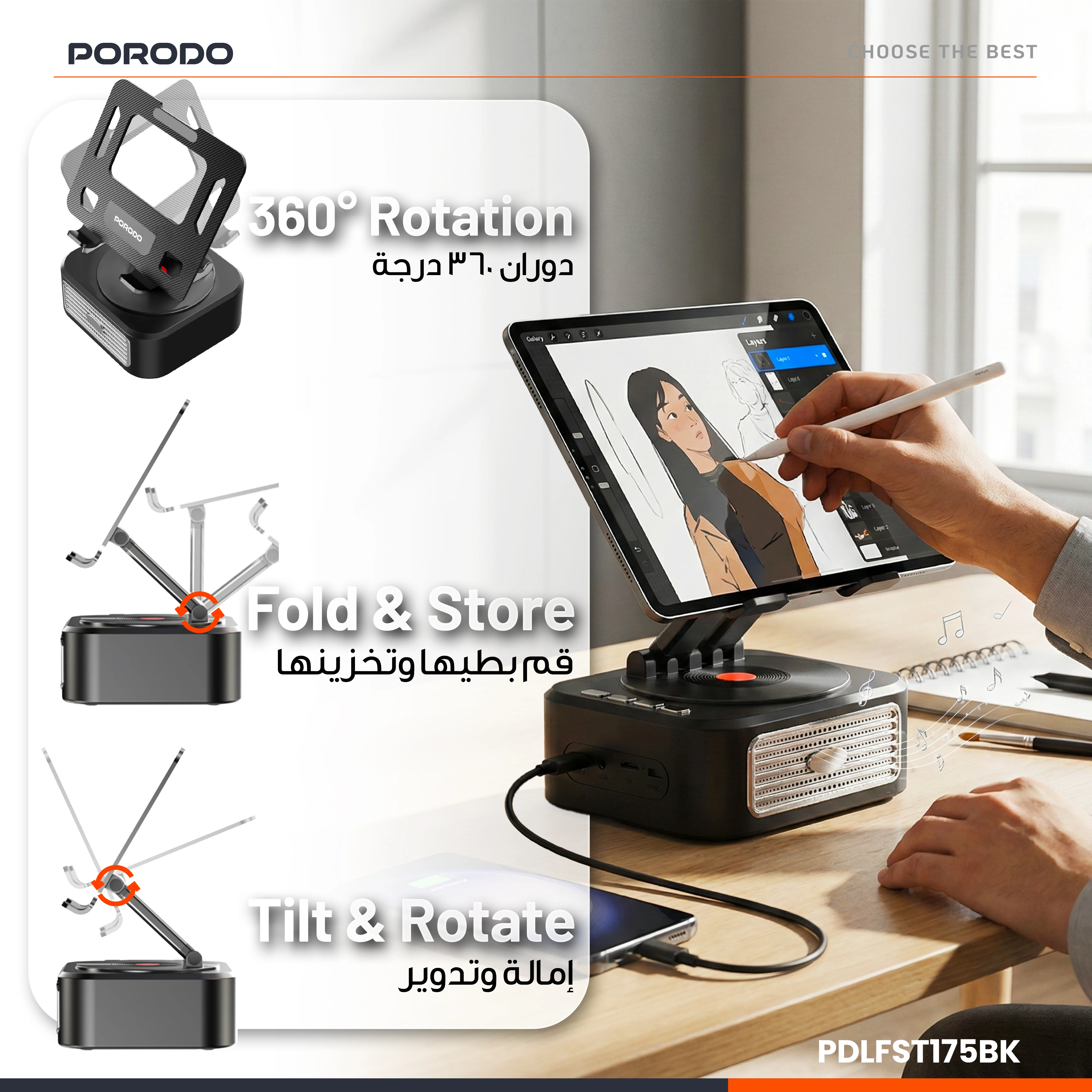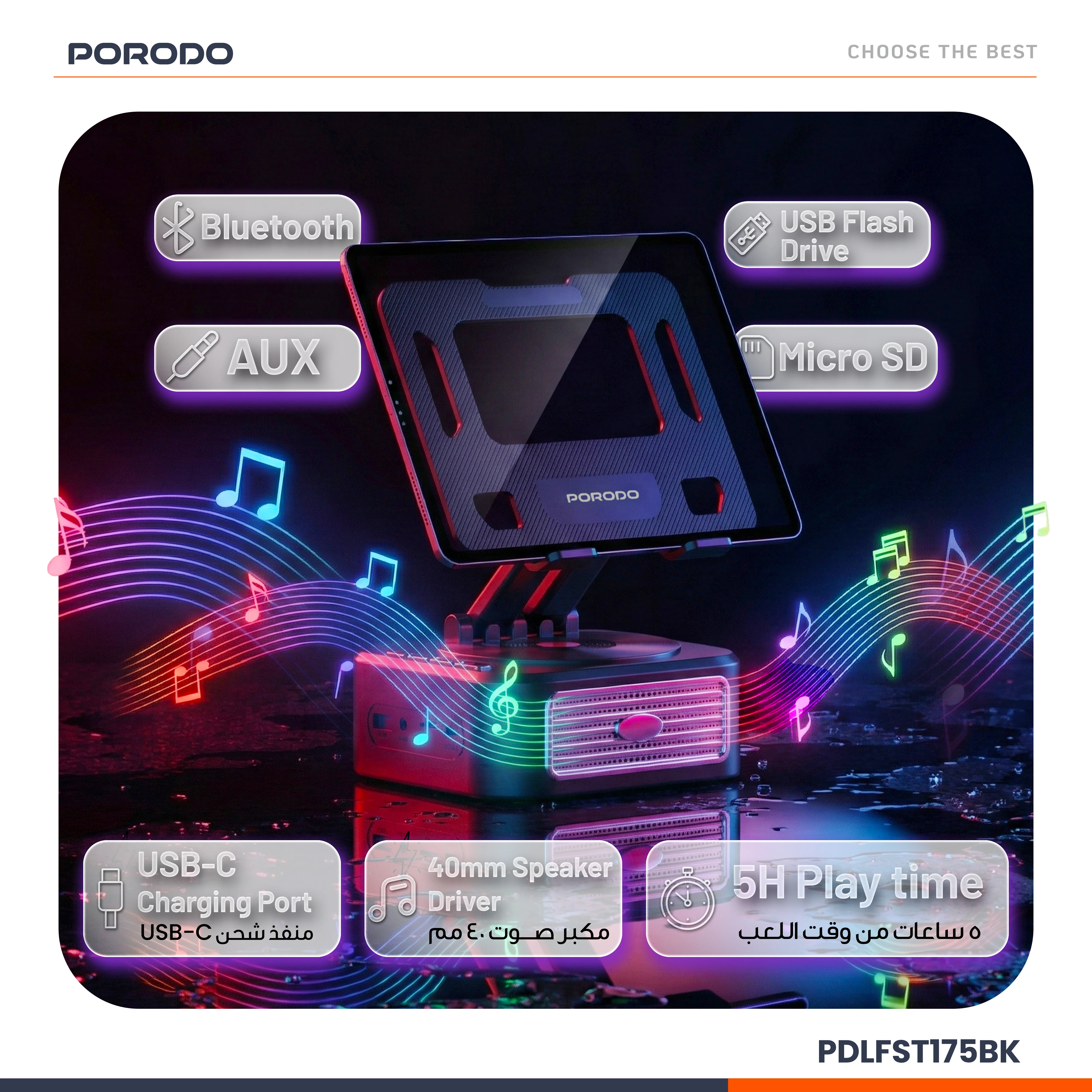 پایه بلندگوی تبلت چندمنظوره Porodo Lifestyle، زیبایی بلند، واضح و همهکاره را در طراحی مشکی هنرمندانه و شیک خود به نمایش میگذارد. این پایه دارای یک درایور بلندگو به اندازه ۴۰ میلیمتر و قدرت ۵ وات است که همه چیز را از موسیقی بلند و واضح گرفته تا صداهای آرام برای نیازهای سرگرمی شما ارائه میدهد. این بلندگو را میتوان به مدت ۳.۵ ساعت متوالی با باتری ۱۲۰۰ میلیآمپرساعتی استفاده کرد و در ۱.۵ ساعت از طریق رابط USB-C بسیار سریع شارژ میشود. داشتن چندین گزینه ورودی صدا، به خوبی توسط بلوتوث، AUX، Micro SD و فلش مموری USB انجام میشود. این پایه یک سیستم نصب رابط سرگرمی است. از چرخش ۳۶۰ درجه پشتیبانی میکند، با تنظیمات زاویه شیب و چرخش برای تنظیم تبلت شما در زاویه دید مناسب، استفاده راحت با زاویه دید آزاد را تضمین میکند. به لطف بلوتوث نسخه ۵.۰، اتصال پایدار میماند. قابلیت تاشو و نگهداری، آن را نامحسوس، جمع و جور و سبک نگه میدارد. راه حل ایدهآل برای کسانی که به دنبال یک پایه چندمنظوره با کیفیت صدای عالی و گزینههای متنوع هستند.